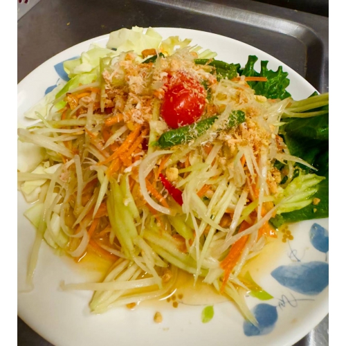 Shredded green papayas seasoned with lime juice, chili, tomatos and crushed peanut.